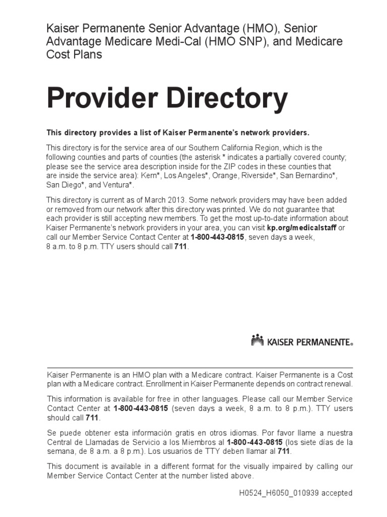 Kaiser Permanente health plans around the country. To get a provider directory or a pharmacy directory if applicable mailed to you you can call Kaiser Permanente at 1-877-201-2757 24 hours a day 7 days a week.